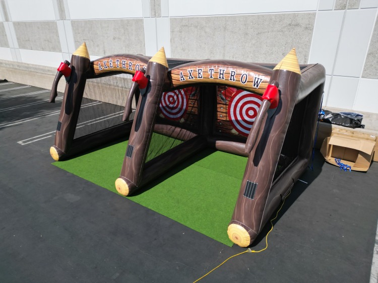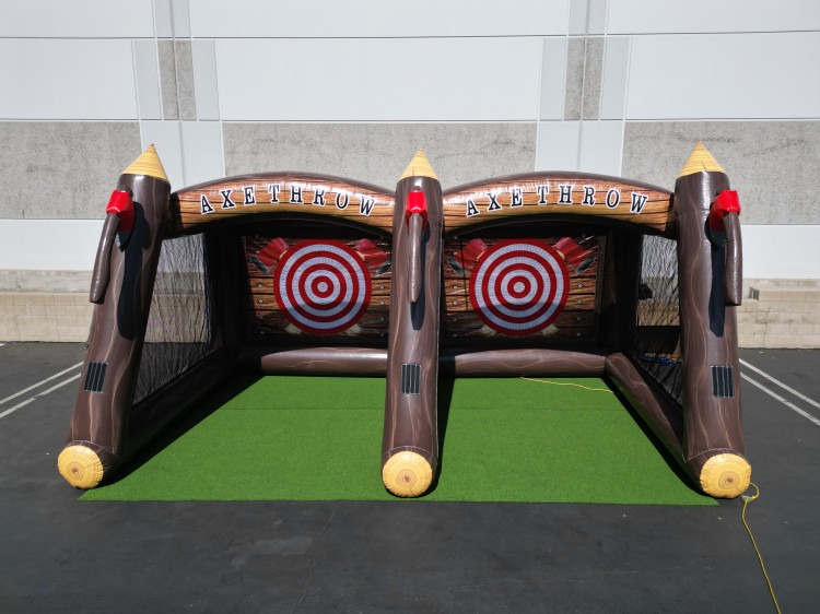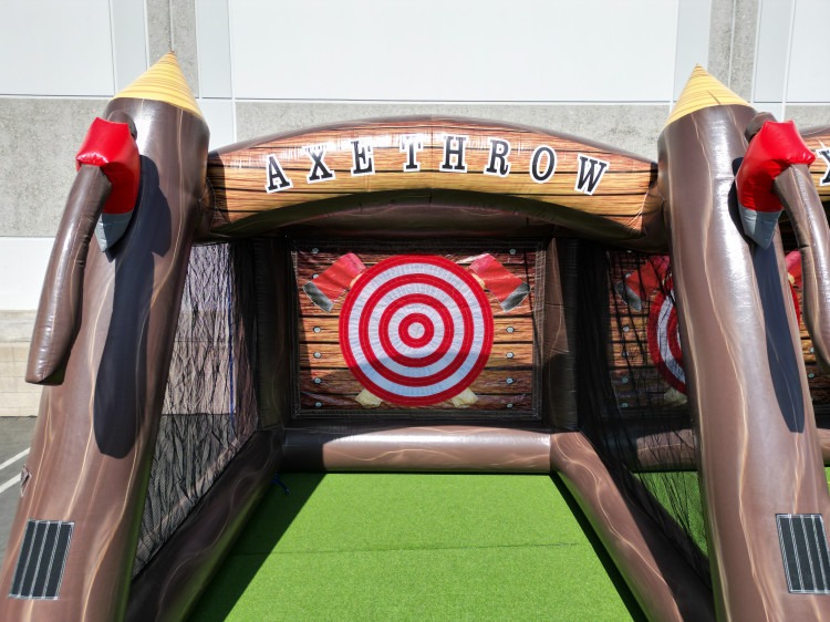 Because it’s designed for rental use, the unit is simple to set up and break down by trained staff and fits well in yards, parks, festival grounds, school carnivals, corporate team-building events, and birthday parties. The two-lane format keeps lines moving faster than a single target, doubles the fun for parties that want a competitive edge, and lets spectators watch both games at once. Safety is prioritized: the “axes” used are oversized, lightweight, and made of soft, foam-like materials so players get the satisfying feel of throwing without any risk of injury. The inflated backdrop and side netting help contain errant throws and give handlers a clear boundary for play.