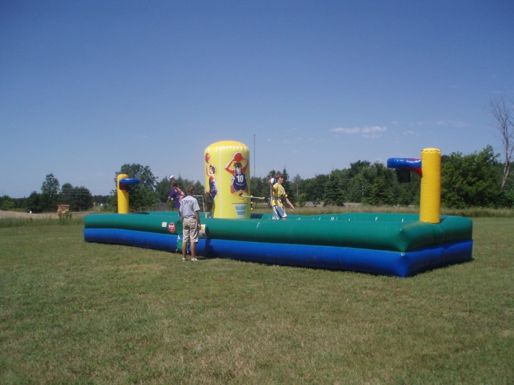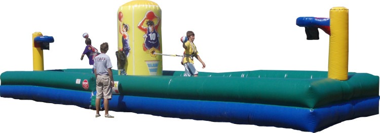 Two players face off on a padded inflatable platform, using oversized jousting poles to try and knock their opponent off balance. It’s a test of strength, balance, and strategy—who will stay standing the longest?